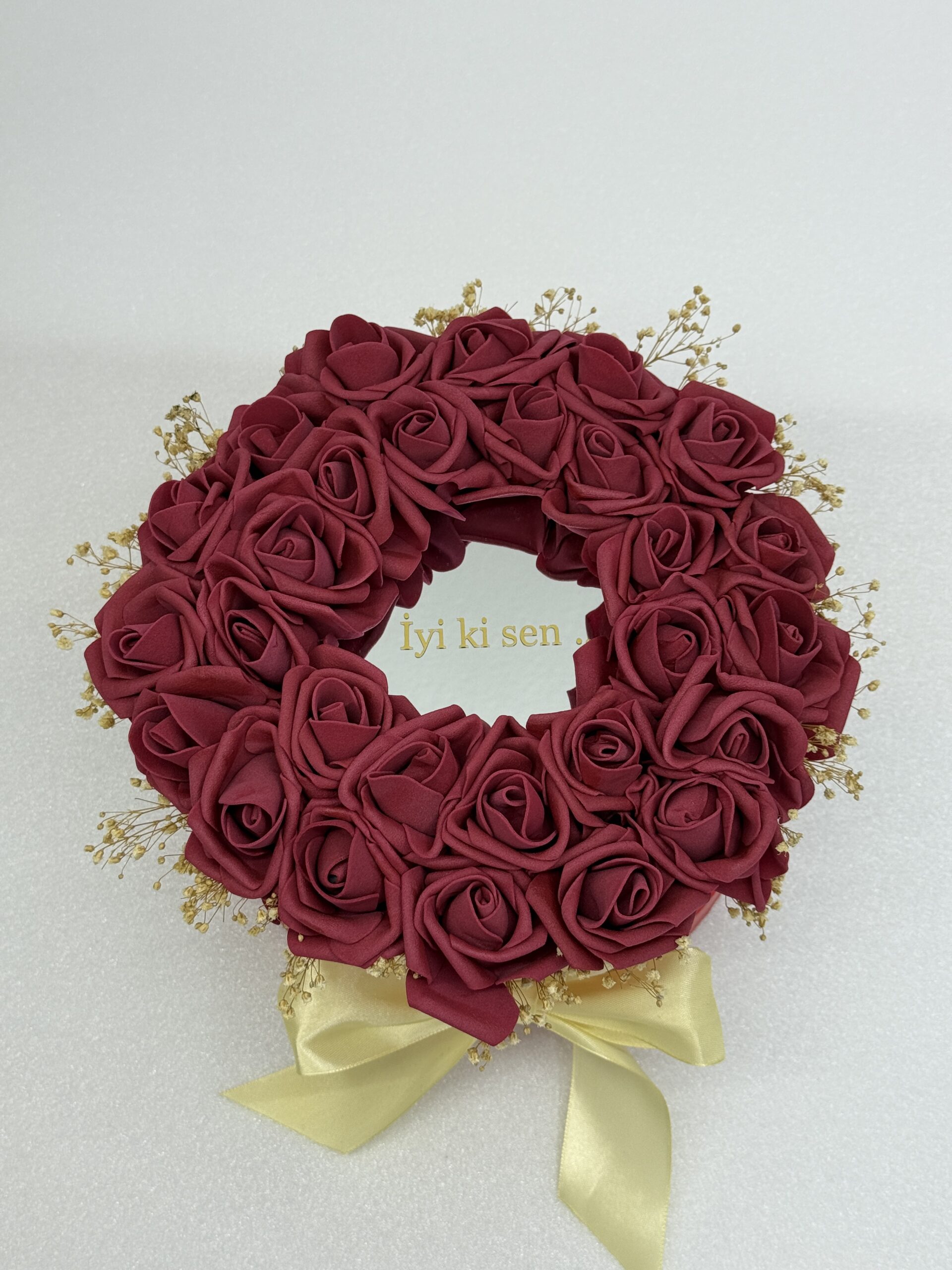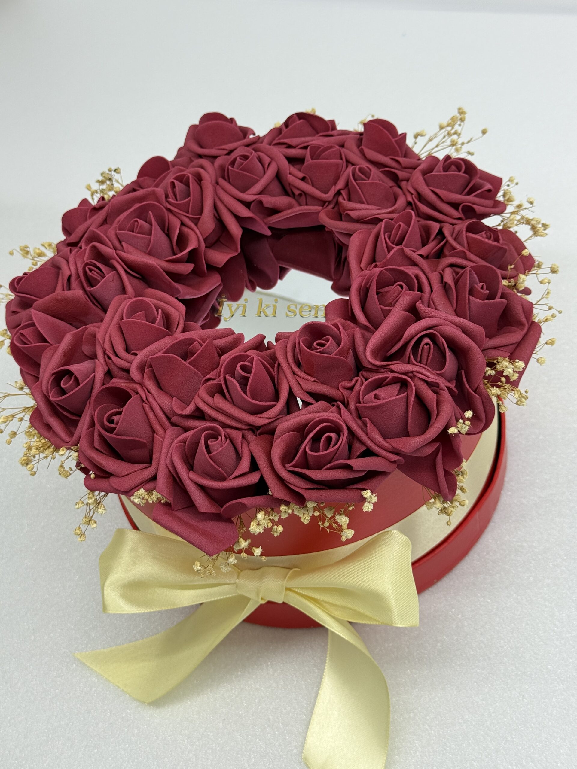 Този елегантен аранжимент включва 28 висококачествени рози, подредени в кръгла форма върху стилна подаръчна кутия. В центъра е поставено огледало със златен персонализиран надпис, което придава уникален и впечатляващ завършек на подаръка.