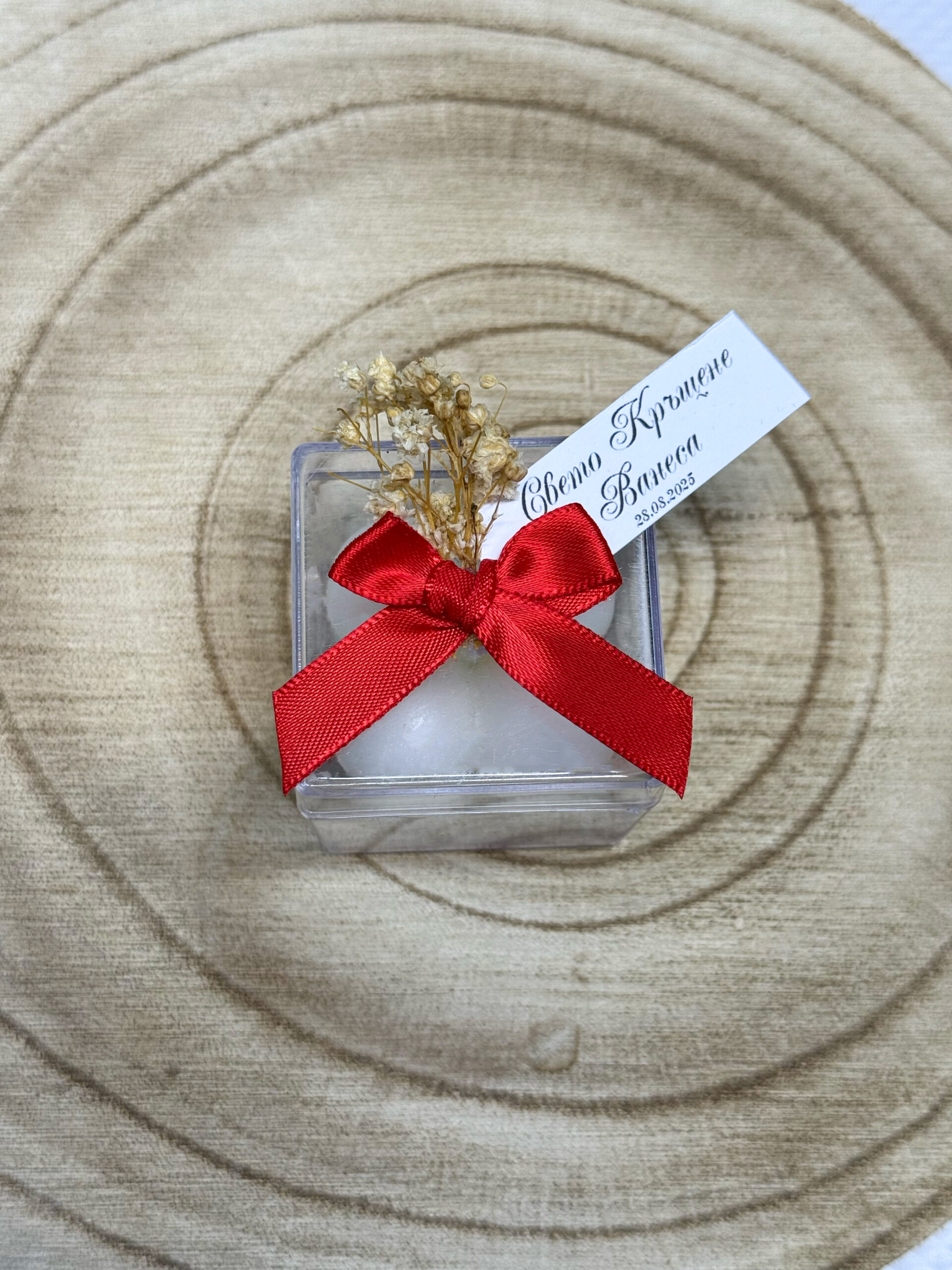 Кутийката е украсена с нежна сатенена панделка и малък букет от сушен гипсофил. Малък етикет с имената на младоженците и датата.