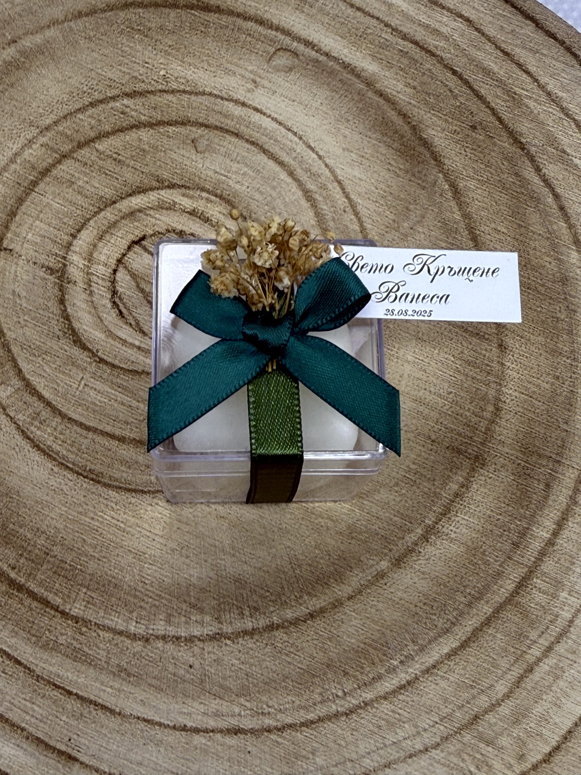 Кутийката е украсена със сатенена панделка в тъмнозелено, допълнена с нежно стръкче сушен гипсофил.