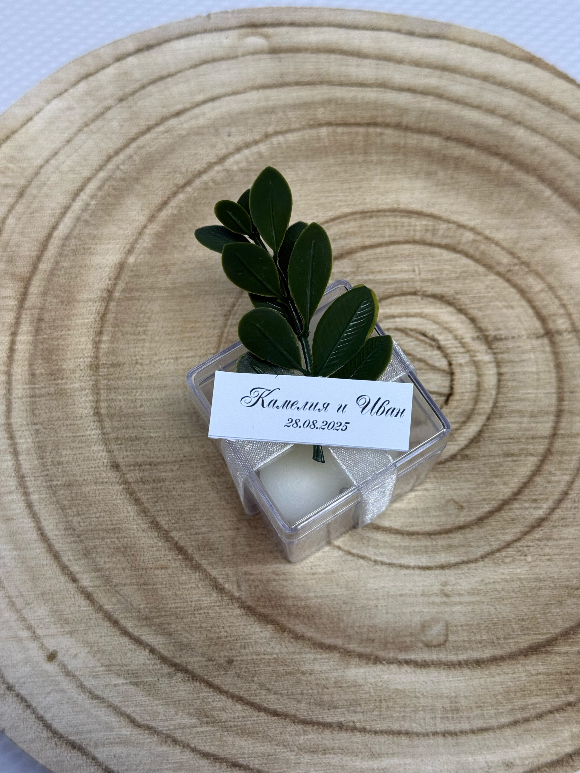 Обвита Кутийката е обвита с фина бяла органзена панделка, спускаща се вертикално и деликатно акцентираща върху опаковката, Върху капачето е добавена изкуствена клонка със зелени листа Малък етикет с имената на младоженците и датата.