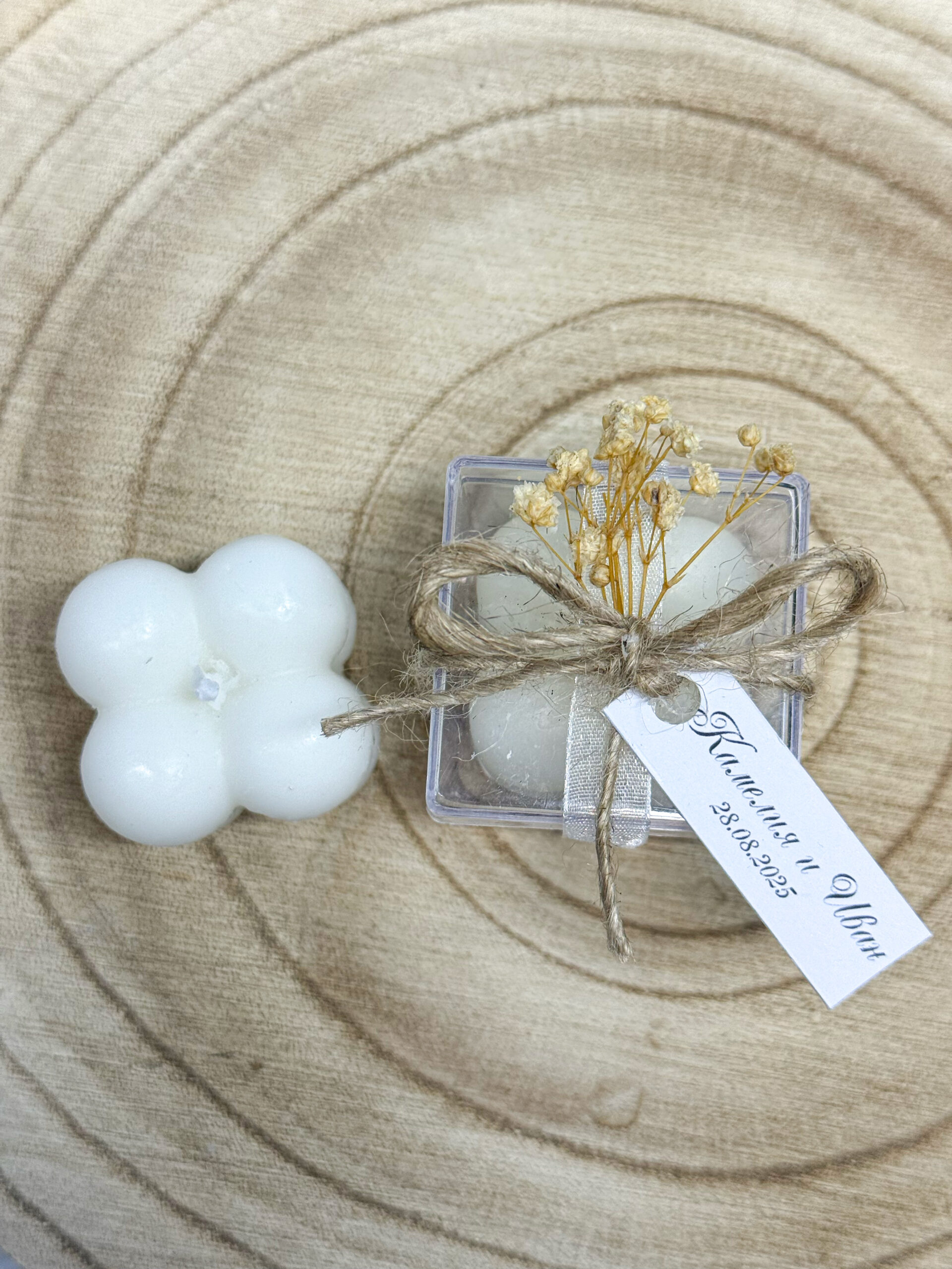 Украсена с Завързана с конопено канапче на панделка, бяла фина панделка от органза,Естествени мини сухи цветя (Гипсофил),Малък етикет с имената на младоженците и датата.