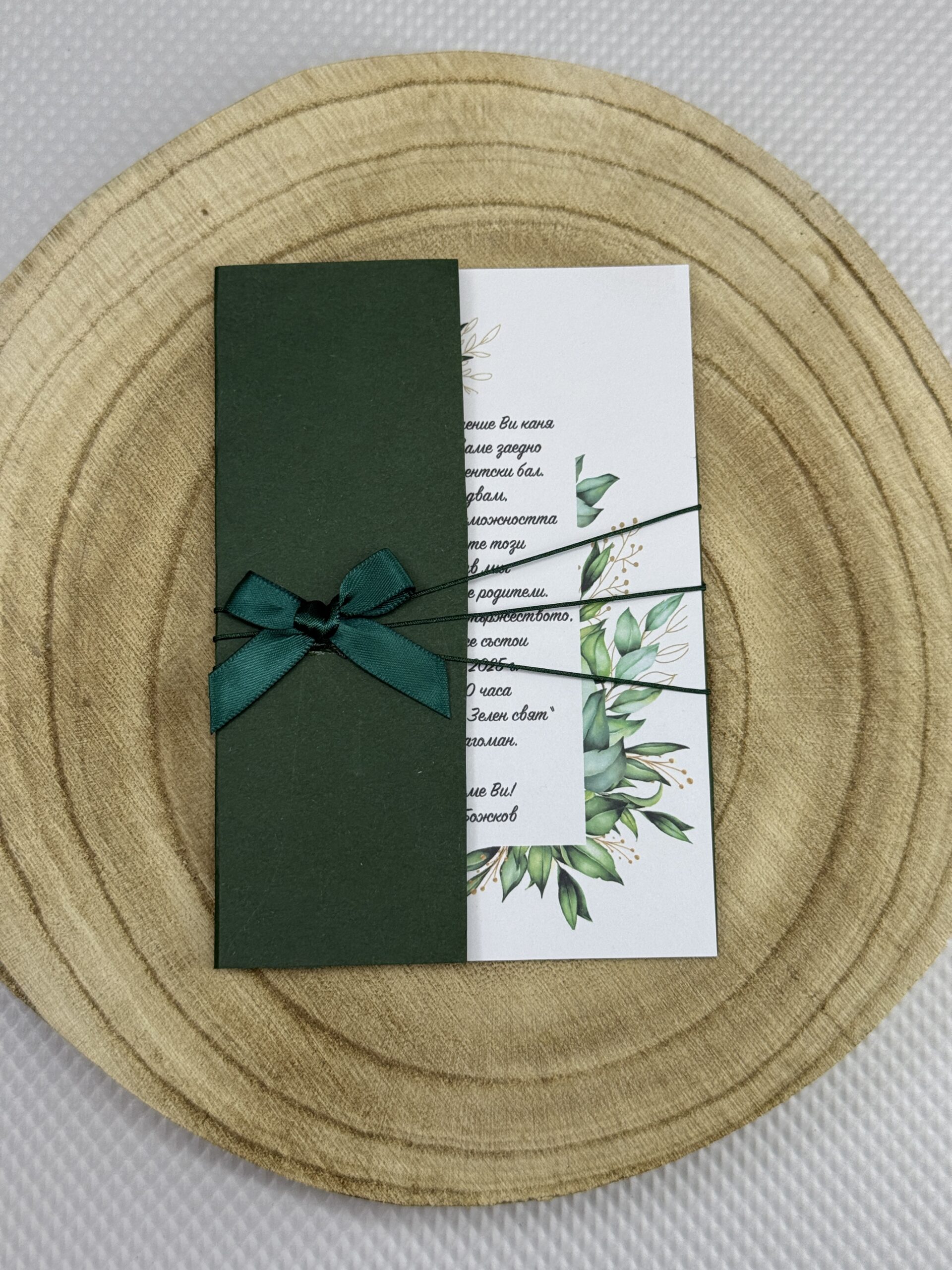 • В зелен цвят украсен с зелено въженце, завързан около поканата и зелена панделка.