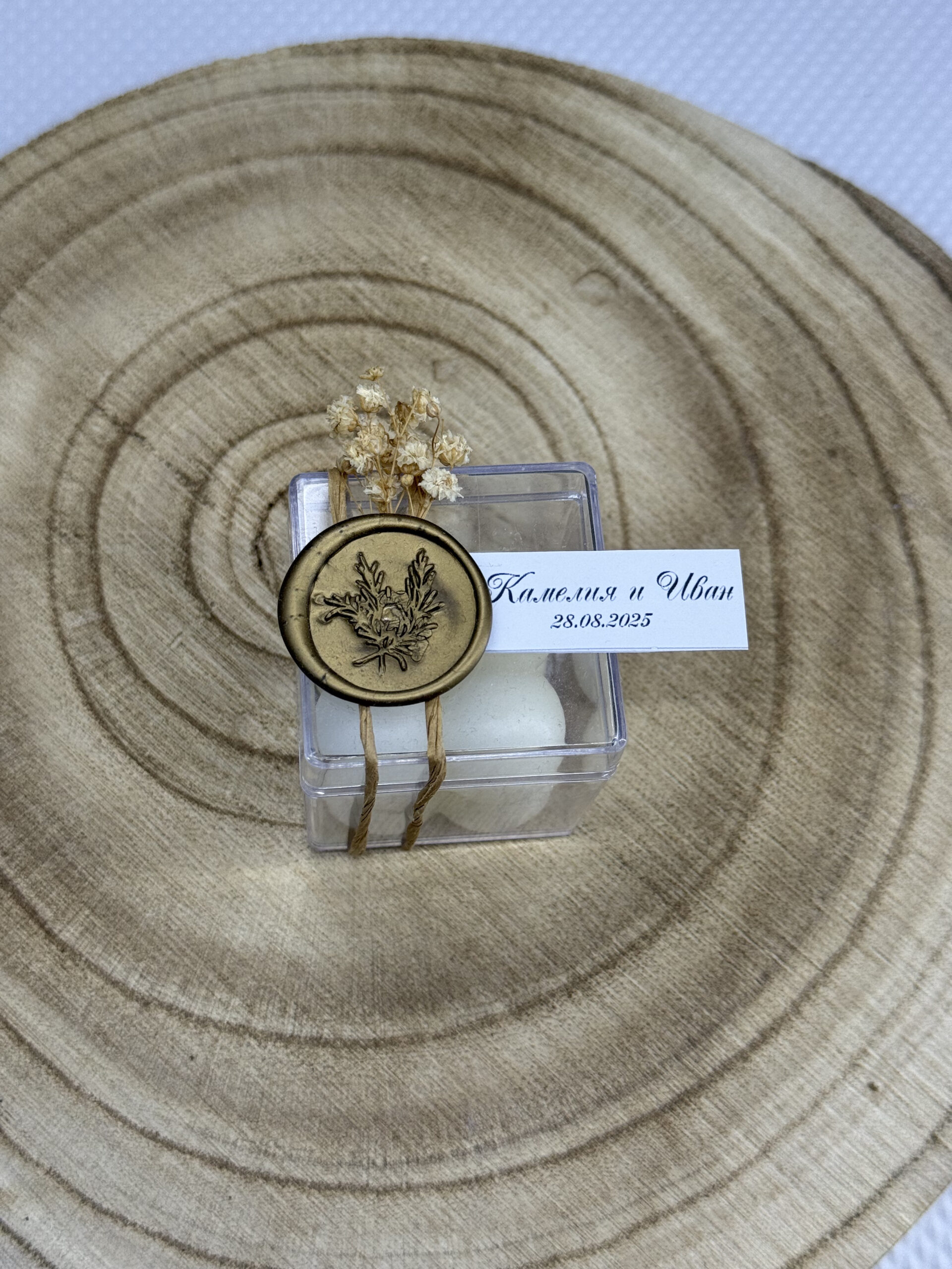 Кутийката е украсена с натурална канапена връзка и восъчен печат с флорален мотив, допълнена с нежно стръкче сушен гипсофил.