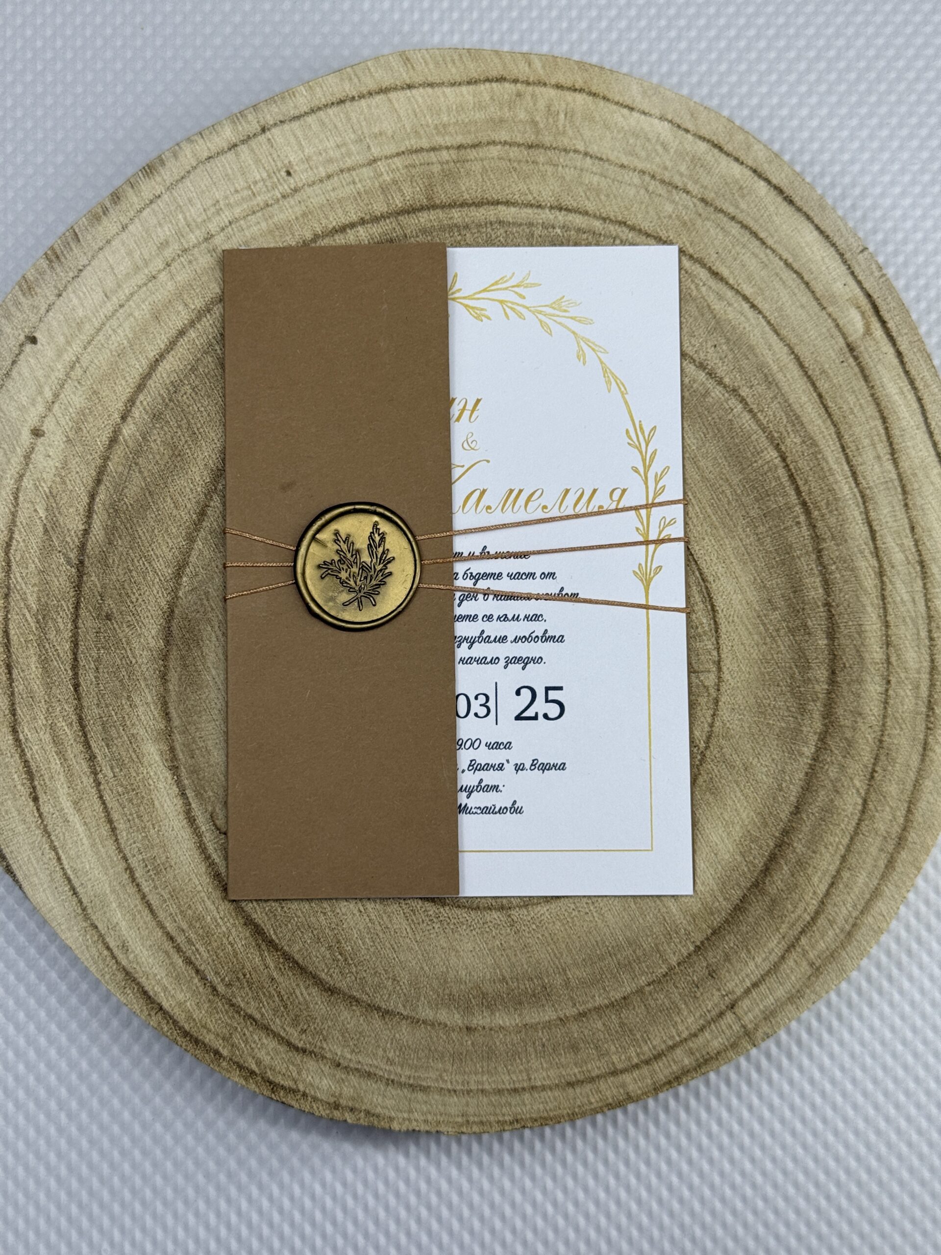 • С включен полу плик размер: 10х15 см. В натурален кафяв цвят украсен с кафяво въженнце,кръгъл восъчен печат в златисто с релефно изображение на листо.