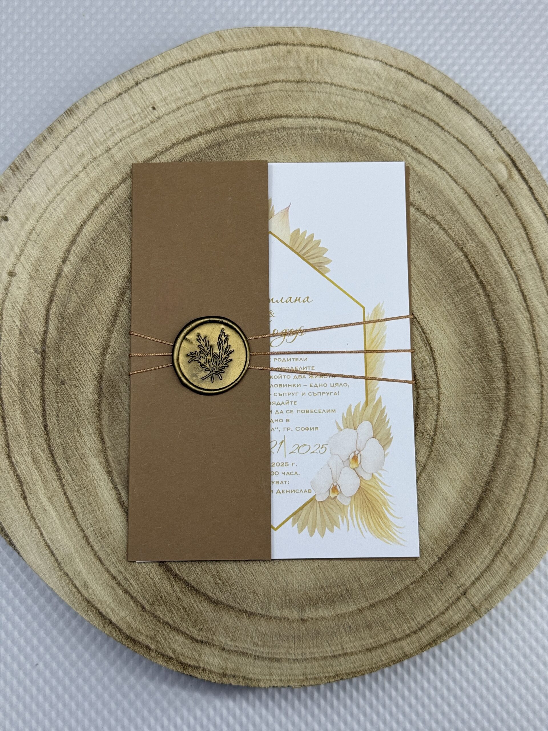 • С включен полу плик размер: 10х15 см.В натурален кафяв цвят украсен с кафяво въженнце,кръгъл восъчен печат в златисто с релефно изображение на листо.