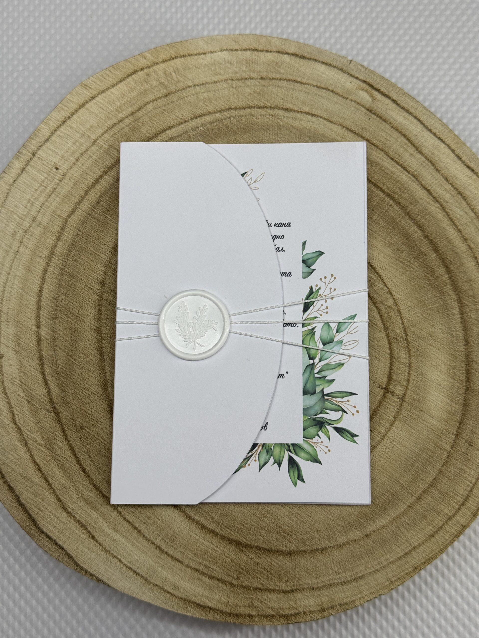 • С включен полу плик размер: 10х15 см. В бял цвят украсен с  бяло въженце, завързан около поканата, и восъчен печат.